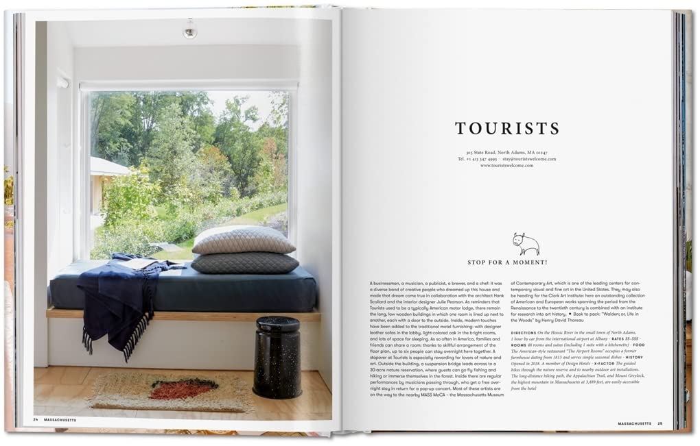 The USA is one of the most varied and fascinating countries in the world. Its areas of natural beauty such as the Pacific Coast, the Yosemite National Park, and Monument Valley are the stuff of great cinema (Hollywood finds its best settings practically in its backyard). For everyone who explores the USA beyond its big cities on a classic road trip, on the trail of Native Americans and pioneers, in the mountains or by lakes and beaches, unforgettable moments are guaranteed. In Great Escapes USA, Angelika Taschen presents remarkable places to stay through impressive photography, entertaining texts, and practical details on how to get there, prices, and tips for books and films. Her journey starts on the East Coast, where intellectuals and artists once met in idyllically located country houses such as the Twin Farms in Vermont and Troutbeck in New York State. It continues to the South, where The Moorings Village and Hôtel Peter & Paul, for example, tell of the history of Florida and Louisiana, and Southern belles such as the Commodore Perry Estate in Austin, Texas reveal their glamor. Dunton Hot Springs, once a miners’ camp in Colorado, now transformed from a ghost town to an upscale rustic resort, lies on the route, just like the urban utopia that is Arcosanti in Arizona, conceived by the architect Paolo Soleri in the 1970s. The trip comes to a wonderful conclusion in California with unique hotels such as Deetjen’s Big Sur Inn, where many famous writers have stayed in the Norwegian-influenced wooden cabins, laid-back motels like The Surfrider Malibu, which is all about the California dream, and heavenly destinations for gourmets, for example SingleThread in Sonoma County with its three Michelin stars. The photography in this opulent publication presents hotels in the tradition of great architects such as Frank Lloyd Wright as well as the work of young contemporary designers and buildings in the typical American mid-century style. A horse ranch, a glamping site, even a hippie bathhouse and vintage mobile homes are also included – places as varied as the USA itself!