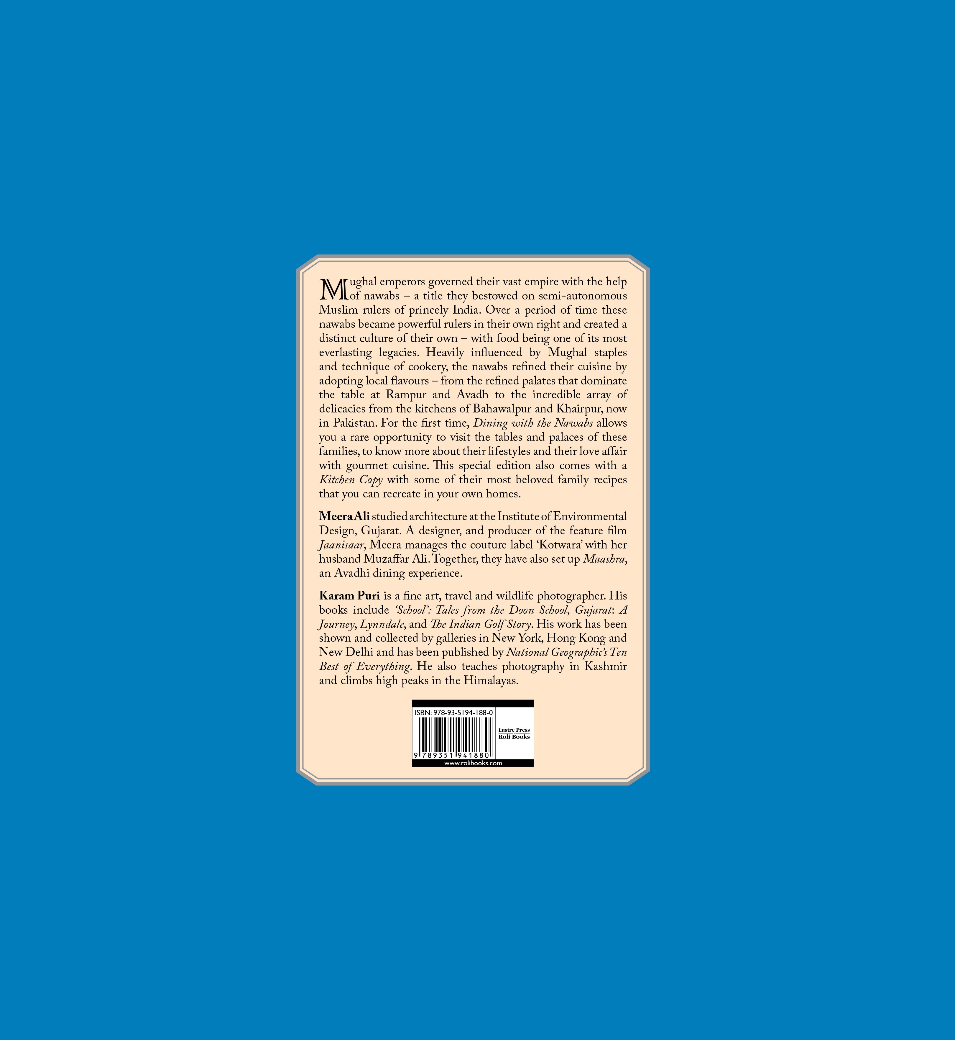 Mughal emperors governed their vast empire with the help of nawabs a title they bestowed on semiautonomous Muslim rulers of princely India. Over a period of time these nawabs became powerful rulers in their own right and created a distinct culture of their own with food being one of its most everlasting legacies. Heavily influenced by Mughal staples and technique of cookery, the nawabs refined their cuisine by adopting local flavours from the refined palates that dominate the table at Rampur and Avadh to the incredible array of delicacies from the kitchens of Bahawalpur and Khairpur, now in Pakistan. For the first time, Dining with the Nawabs allows you a rare opportunity to visit the tables and palaces of these families, to know more about their lifestyles and their love affair with gourmet cuisine. This special edition also comes with a Kitchen Copy with some of their most beloved family recipes that you can recreate in your own homes.