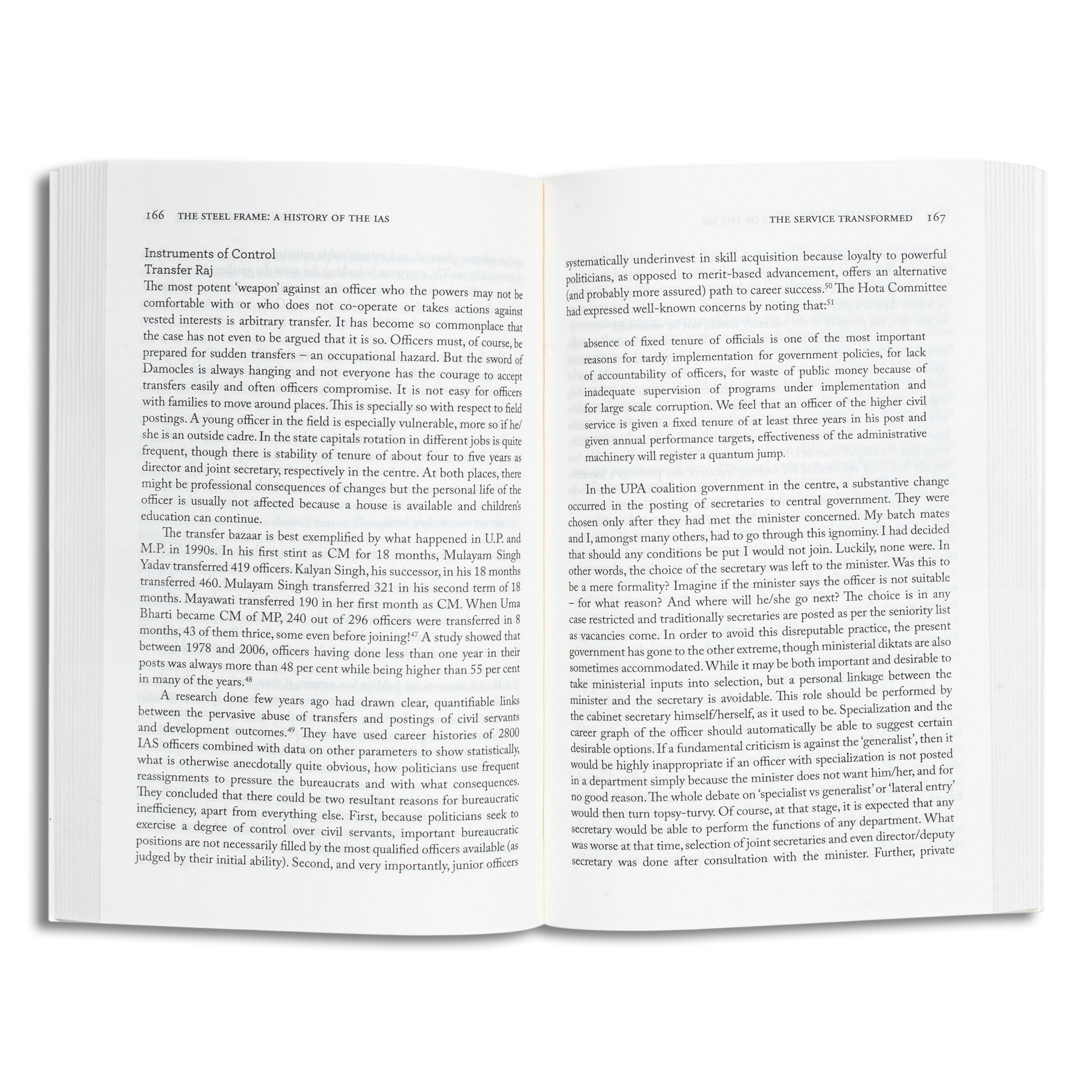 The development and role of the Indian Civil Service was one of the dominant features of the period of the East India Company and later, British rule in India. It is extraordinary how people employed by a trading company in a foreign land transformed into the most powerful Civil Service in the world. It was also the first Civil Service in the modern world where recruitment was on the basis of open competition and not through patronage. Though much criticized, it developed its own character and traditions. It is really unusual that such a service defined as the Steel frame', on which depended the fortunes and the survival of a huge empire continued essentially with the same structure and traditions, along with the administrative systems developed over a century, into independent democratic India. Although much has changed, even today the Indian Administrative service retains some basic characteristics from the past. This system of governance as it evolved in India is indeed fascinating story. Well researched and detailed in its presentation, Deepak Gupta looks at changes from the past, its present and also the future of the IAS. He also suggests some measures so that it could re-invent itself to play the important role envisaged by the makers of our Constitution.